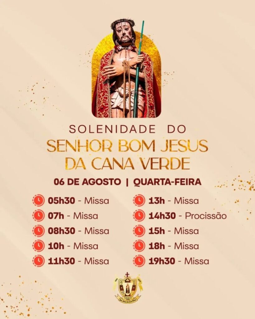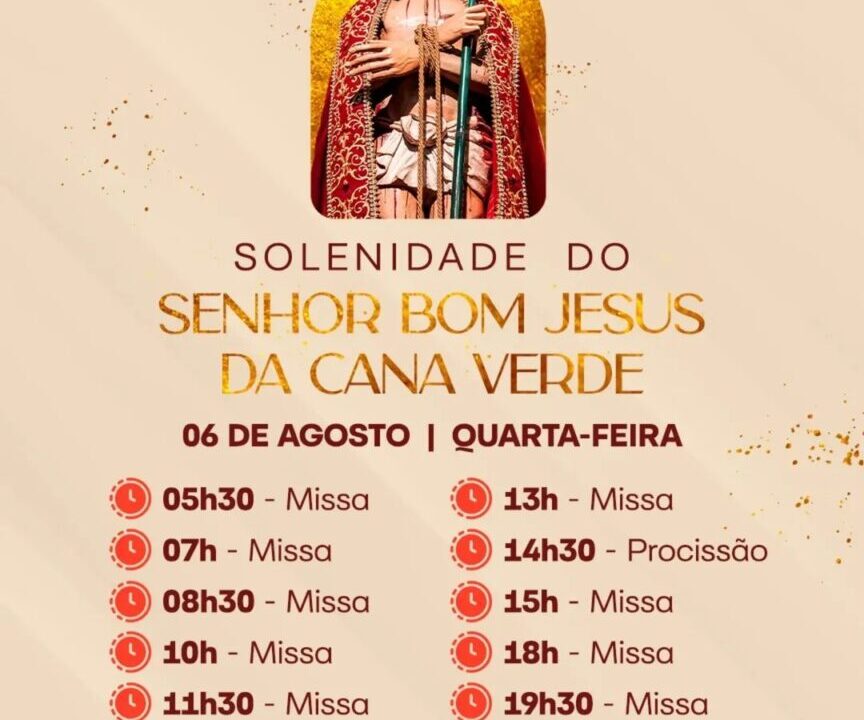 04/08/2025Confira a programação das Missas no dia 6 de agosto, Solenidade do Senhor Bom Jesus da Cana Verde!Em 6 de agosto, a comunidade se reúne em um dia especial […]